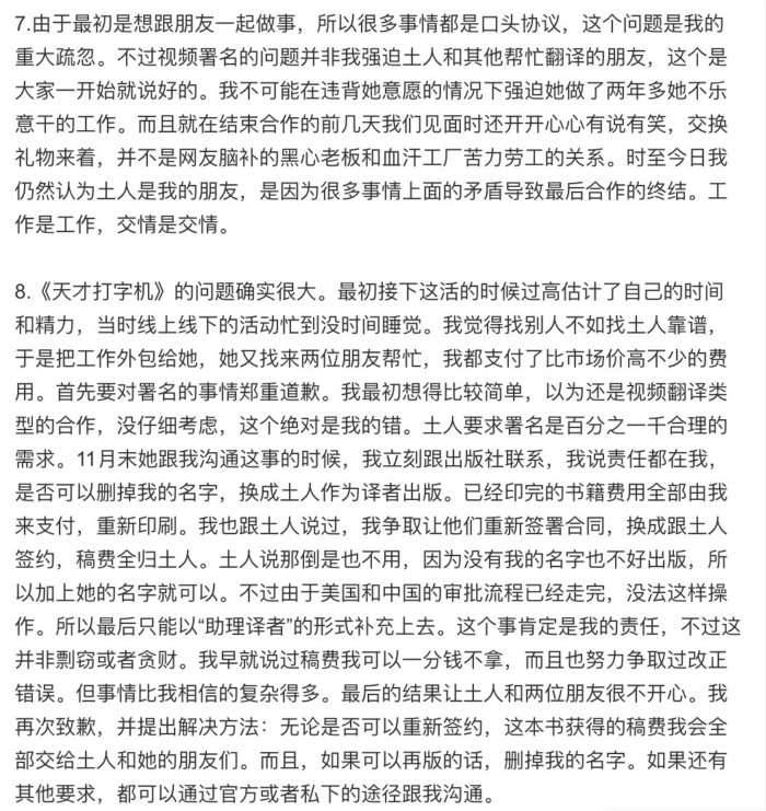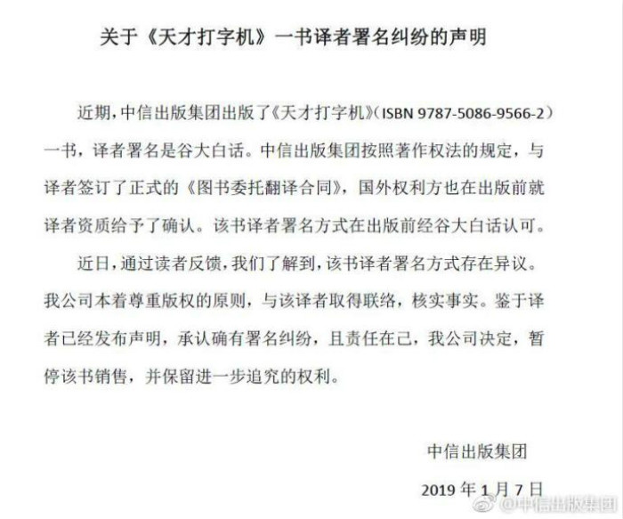 7日晚间,《天才打字机》的出版方中信出版集团发布声明,表示暂停该书销售。谷大白话转发该声明表示,自己将承担书籍召回的费用,所有稿费将给a土人和她的朋友,去掉自己的署名,让a土人和她的朋友跟出版社重新签订合同,重新走出版流程。