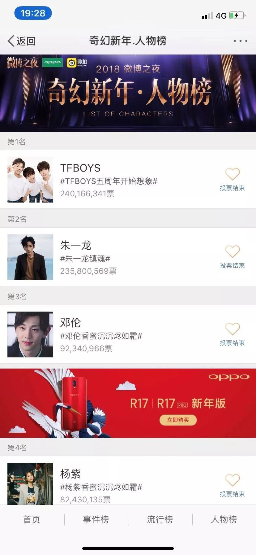 今年,微博取消了KING&QUEEN的评选,改为2018热点人物的评选。年纪小小已经是顶级流量圈常驻将军的TFBOYS粉丝和新晋流量朱一龙的粉丝历经了一个月的激烈battle后,以2.4亿票领先第二名430万票的优势胜出。