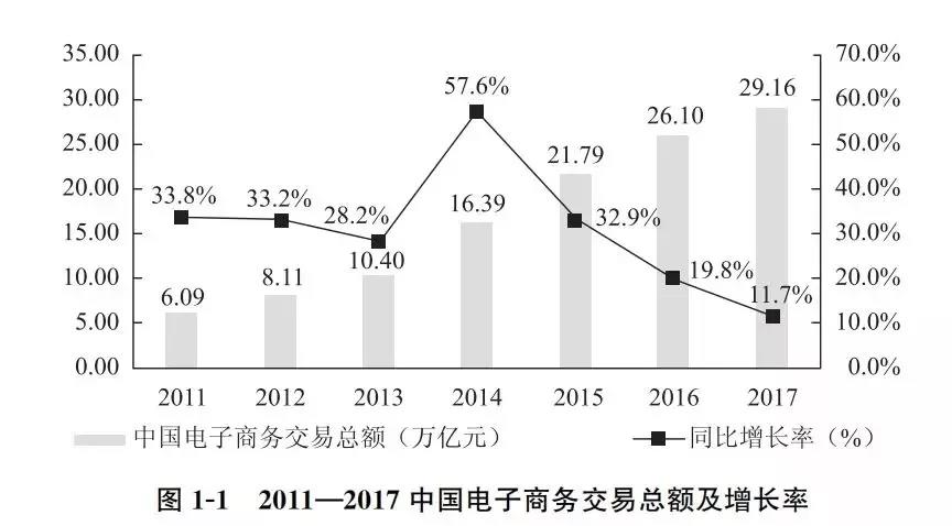 根据《2017中国电子商务报告》显示,2017年中国电子商务交易额达29.16万亿元人民币,同比增长11.7%。这其中,中国网上零售额达7.18万亿元,同比增长32.2%,占全年社会消费品零售总额的19.6%。如今的电子商务已然成为中过人消费行为的一个主要渠道,在资源配置上起到了关键性的作用。