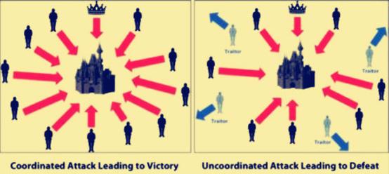 他们依靠通信兵相互通信来协商进攻意向及进攻时间,不确定是否有叛徒,叛徒可能擅自变更进攻意向或者进攻时间或者传递虚假信息,拜占庭将军们能否找到一种分布式的协议来让他们能够远程协商?这就是著名的拜占庭将军问题。