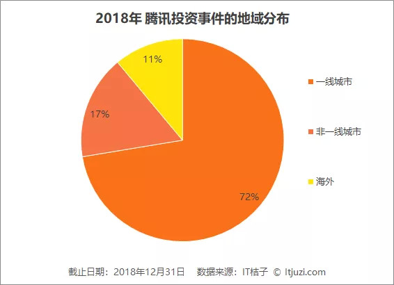 从腾讯在 2018 年的投资区域分布来看,一线城市(北京、上海、广州、深圳)占比超过 60%,非一线城市占比仅为 17%。另外,腾讯在海外的投资布局占比达 11%,相比于 2017 年的占比超过 20% 有所下降。