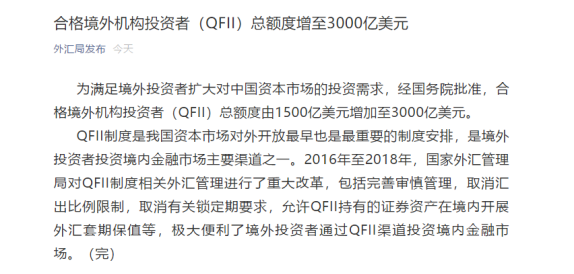 1月14日,外汇局发布公告,为满足境外投资者扩大对中国资本市场的投资需求,经国务院批准,合格境外机构投资者(QFII)总额度由1500亿美元增加至3000亿美元。