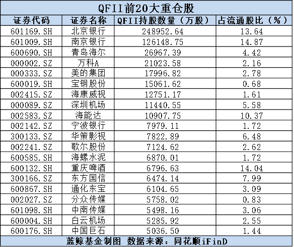 整体来看,QFII的前十大重仓股包括了北京银行、南京银行、宁波银行三只银行股,此外还有美的集团、万科A、青岛海尔等白马股。其中,荷兰安智银行持有北京银行248952.64万股,占流通股比13.64%,位居北京银行第一大流通股股东。
