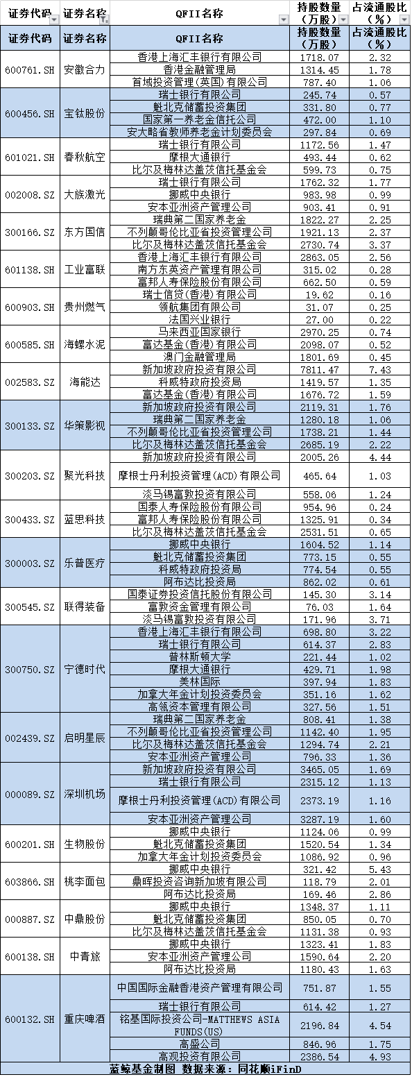 据同花顺iFinD数据统计,合计有春秋航空、东方国信等22只个股有不少于3家的QFII重仓。