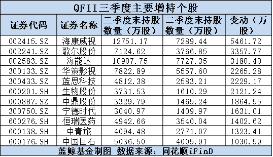 在增持个股方面,“安防之王”海康威视被增持了5461.72万股,使得三季度末QFII持股数达12751万股,位列QFII的前十大重仓股。其次为歌尔股份、海能达、宁波银行等,增持数量均超过1000万股。