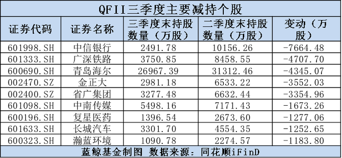 在减持个股方面,QFII减持最多的是中信银行,数量达到了7664万股。其次为广深铁路、青岛海尔、金正大、圣光集团等,共9只个股被QFII减持超过1000万股。