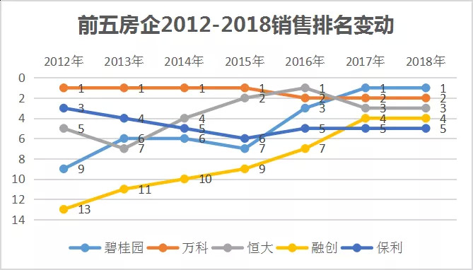 从图中可以清晰地看到融创的进阶史:2011年,融创合同销售金额尚且排在行业第18位;2012年升至第13位;2013年第11位;2014年突入前10;2015年行业排名第9;2016年排名第7;2017年实现销售金额3620亿元,同比增长140%,行业排名第4;2018年保住了第四的位置,开始向前三出发。