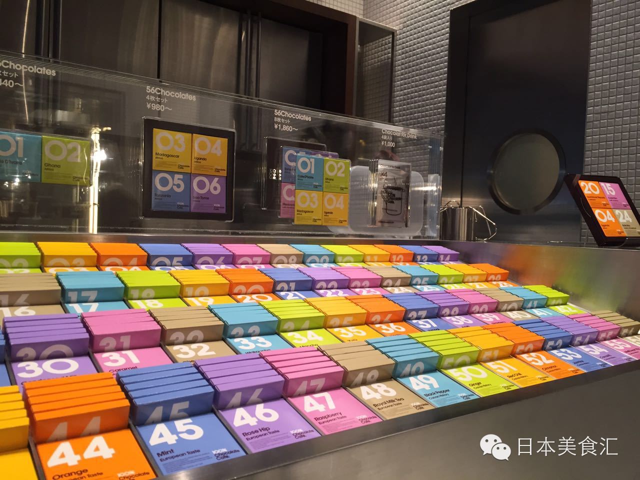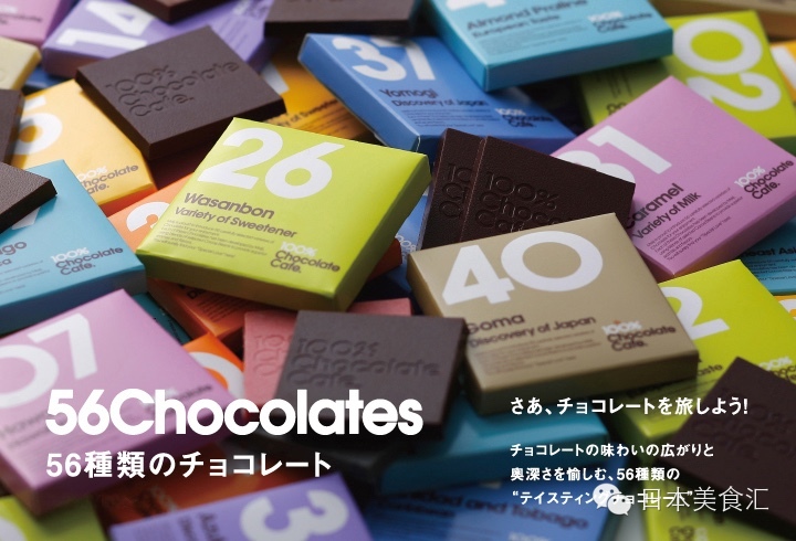 等候时间,我翻开小册子开始研究那56种巧克力,一共分为六个大类,其中1-22是单一可可豆的味道,主要是以产地来区分;23-27是与各种甜味的结合,比如黑糖味、蜂蜜味;28-32是与各种奶味的结合,比如北海道牛奶巧克力、练乳、起司巧克力;33-40是日本开发的特别味道,比如抹茶巧克力、芝麻巧克力;41-48是欧洲风味,比如橙味、薄荷味巧克力;49-56是在可可历史上有里程碑意义的味道,比如姜味、肉桂味、茉莉味巧克力。