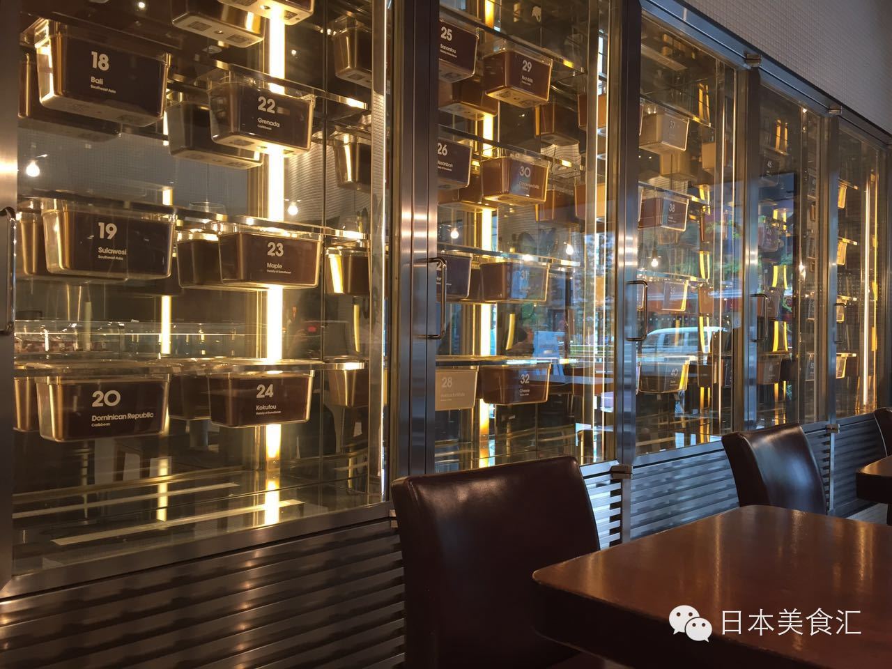 在深感幸福的气氛中打量咖啡厅的店堂,面积不大,但设计可谓处处精心。既然是巧克力为主题,天花板就是一大块板巧克力,右面整个一面墙是很像葡萄酒冷藏柜的生巧克力的展示橱窗,里面陈列着明治根据香味、颜色、口感、余韵等细分出的56种生巧克力,而在左手边营业柜台的最里面,正是这56种巧克力经过精心包装的售卖柜台,那色彩搭配、陈列摆放让人看一眼就会被吸引,想要花更多的时间了解巧克力分类的奥妙。