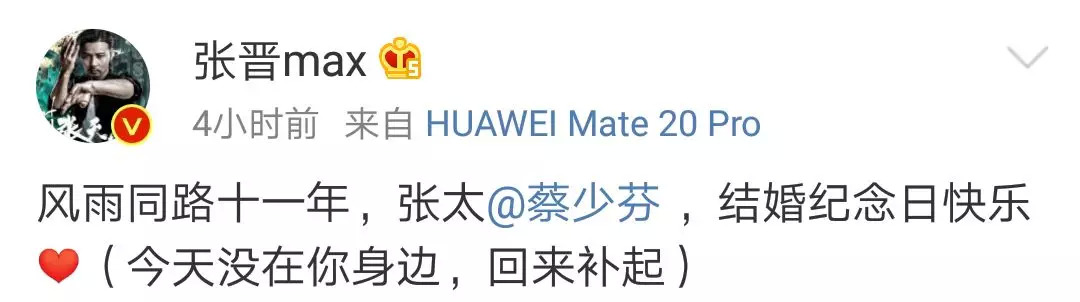 前两天,张晋在微博庆祝与蔡少芬结婚十一周年,并分享一家四口近照,深情喊话:“风雨同路十一年,张太,结婚纪念日快乐”。幸福温馨!