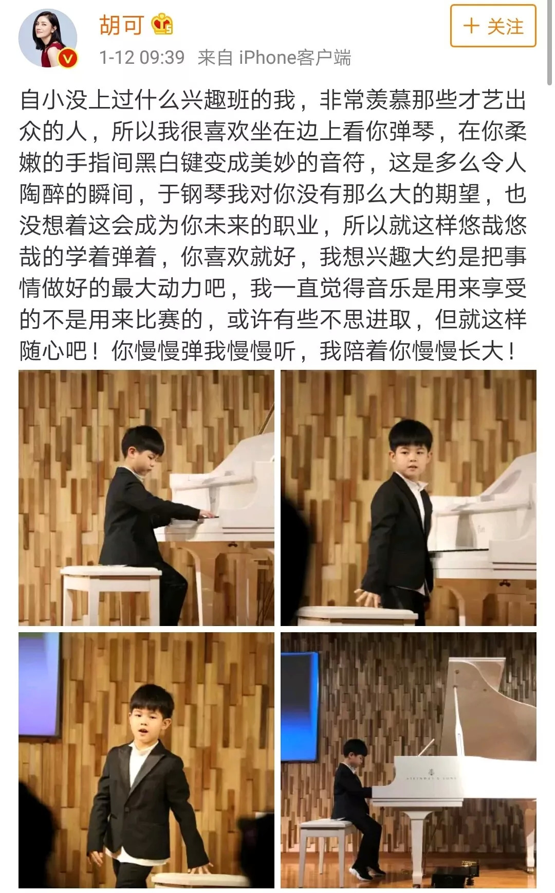 今天,胡可在微博分享儿子安吉弹钢琴的照片并配文:“自小没上过什么兴趣班的我,非常羡慕那些才艺出众的人,所以我很喜欢坐在边上看你弹琴,你慢慢弹我慢慢听,我陪着你慢慢长大!”照片中,安吉身穿黑色小西装搭配白衬衫,端坐在一架白色钢琴边。