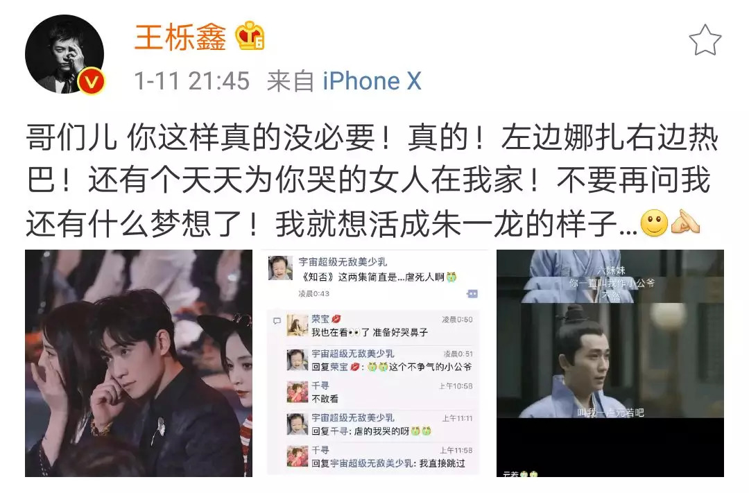 随后,王栎鑫在微博发出一组朱一龙的照片,并配文:“哥们儿,你这样真的没必要!左边娜扎右边迪丽热巴!还有个天天为你哭的女人在我家!不要再问我还有什么梦想了!我就想活成朱一龙的样子。”