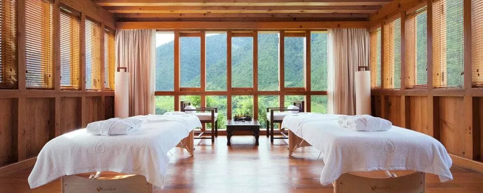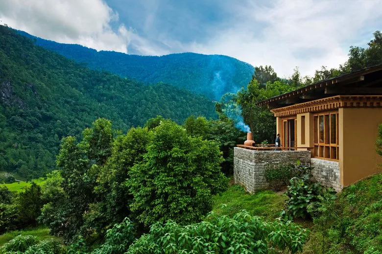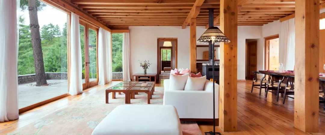 请来新加坡籍设计师 Cheong Yew Kwan使用大量当地建筑材料,并与不丹当地艺术家配合共同打造了这座奢华但低调的饭店。整个酒店似乎就是不丹文化景观的缩影,不论是室外或室内,都能看到不丹元素。