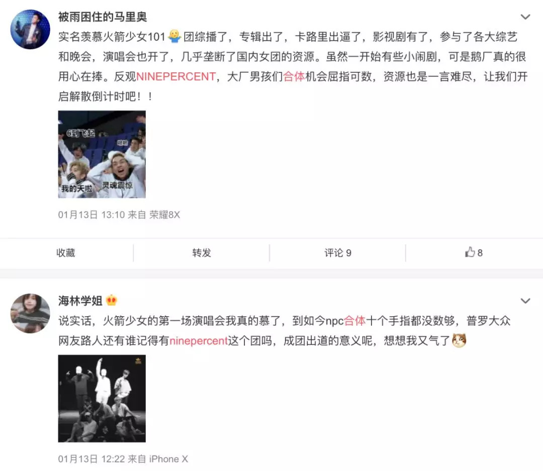 与隔壁强势的钮祜禄·鹅相比,爱奇艺与百分九的运营公司爱豆世纪在对团体的运营上着实不力。在团员个人单曲几乎都出了一轮了,百分九的团专才在11月迟迟上线,但至今并无几次合体表演的机会,而说好的团综,一年了依然不见踪影。看着别人家的团资源,不少百分九的粉丝表示了意难平。