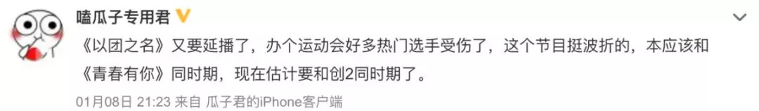 近日,微博传出优酷综艺《以团之名》举办内部运动会时,多名热门选手因受伤无法继续录制节目,节目将延期到3月播出。目前节目官博尚无任何延播迹象,每日物料也在正常发布中。但无论是1月或3月播,都无可避免的与爱奇艺、腾讯两档已有粉丝基础的节目对抗。