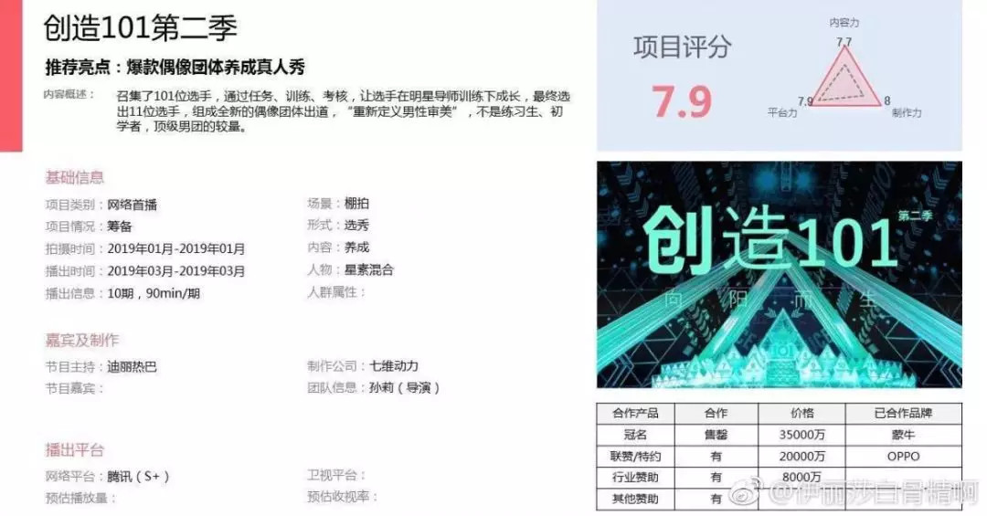 另一边,《创造101》第二季除了在2019腾讯V视界大会上官宣了迪丽热巴为发起人,其他宣传物料迟迟没有露出。近日网上则爆出了该节目招商尚未结束,已经拿到了蒙牛3.5亿冠名费及OPPO2.5亿的合作费用。从至少6亿的投资额来看,《创造101》第二季必定又是一场血雨腥风。