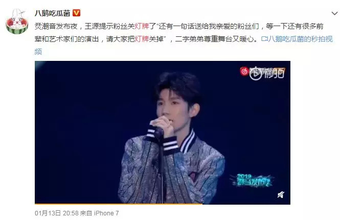 1月13日,在腾讯视频烎潮音发布夜直播结束后,导演徐涵发微博指责王源粉丝携带大量灯牌破坏发布夜整体舞美设计,并且直接在微博上@王源本人以及其各大粉丝团。随后又因粉丝的事实反驳而出面道歉称“发博只是指出灯牌问题,并非特指艺人”。一场因灯牌引起的风波使人们将焦点从发布夜舞台移动到看台。