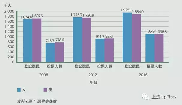 女性的高劳动参与率带来的直接影响就是在社会各个领域的政治参与度直接大幅上升。在2016年的香港登记选民和投票人数男女占比中,女性甚至超越了男性。