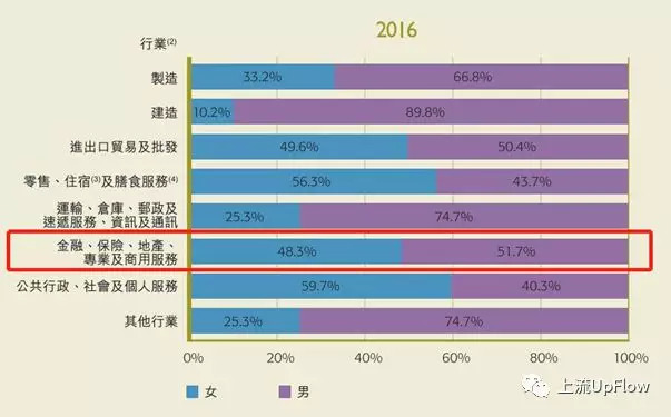 在金融、保险和专业服务领域的女性从业者几乎跟男性平分秋色。