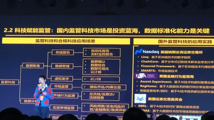 我还想分享一个提供金融机构的解决方案,一个细分的赛道是监管科技和合规科技。这两者之间的区别在于监管科技是从监管者的角度想,怎么能用技术手段来实现监管的目的。怎么能够监管二级市场,怎么能够监管一级市场,怎么能够监管整个跟借贷相关市场的不同机构或者非持牌机构的经营活动,这块监管实际上是非常滞后的。包括消费金融、P2P等,我觉得也可以把它纳入整个监管的体系。