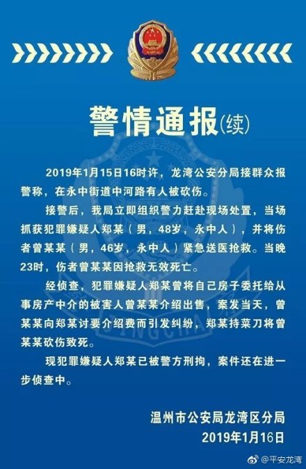 据浙江温州龙湾公安分局官方微博16日消息,1月15日16时许,龙湾公安分局接群众报警称,在永中街道中河路有人被砍伤。经侦查,犯罪嫌疑人与房产中介因房屋介绍费发生纠纷,持菜刀将被害人砍伤致死。目前犯罪嫌疑人已被刑拘,案件还在进一步侦查中。