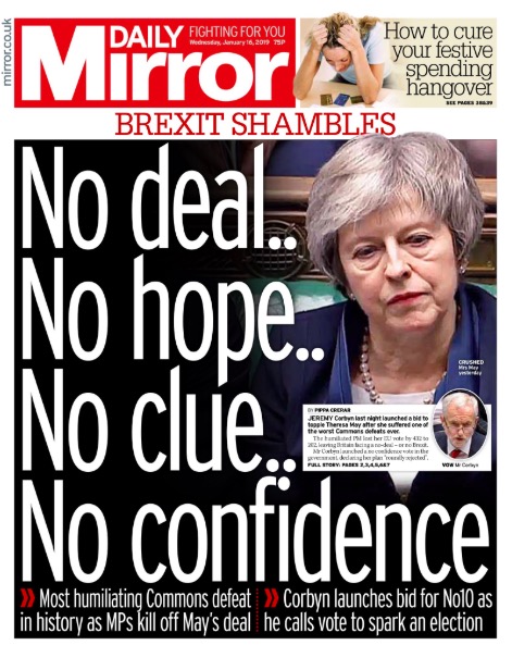 毫无疑问,议会的投票结果在英国国内投下了一颗重磅炸弹,这一消息也牢牢占据了英国各大媒体的头版头条。而他们对梅的态度并不友好。