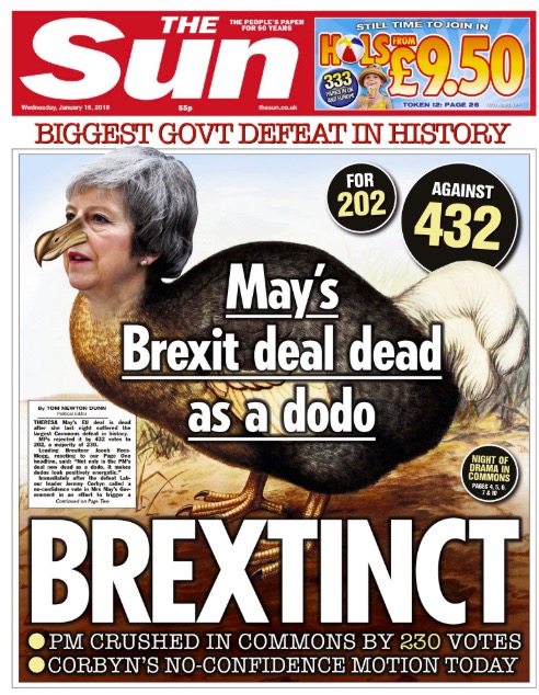 英国《太阳报》15日的头条标题为“脱欧灭绝——梅的脱欧协议像一只渡渡鸟一样死去了”,并把梅的脸嵌在了一只渡渡鸟的身上。被称为愚鸠的渡渡鸟是一种已经灭绝的不会飞的大型鸟类,“dodo”一词则来源于葡萄牙语的“doudo”或“doido”,意为愚笨。