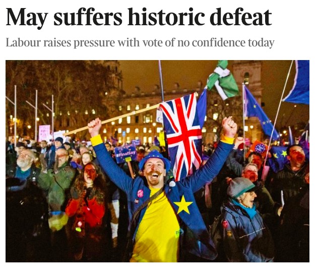 作为主流媒体的《泰晤士报》则稍显理性和克制,头条标题为“梅遭遇历史性失败”,但配图却是反对者在投票结果出炉后振臂欢呼的照片。
