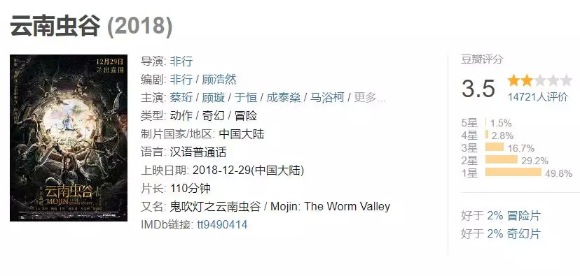 比如电影《九层妖塔》中的故事情节、人物设置、故事背景均与原著相差甚远,甚至还被天下霸唱控告侵犯著作权;网剧《牧野诡事》打着“鬼吹灯”的名号,除了名字一样,内容完全是另一个故事,编剧与原著故事情节脱离;最新影片,《云南虫谷》上映后,豆瓣评分只有3.6分,影片评论区一片吐槽声外,上映11天票房仅1.48亿元。