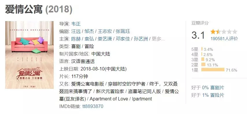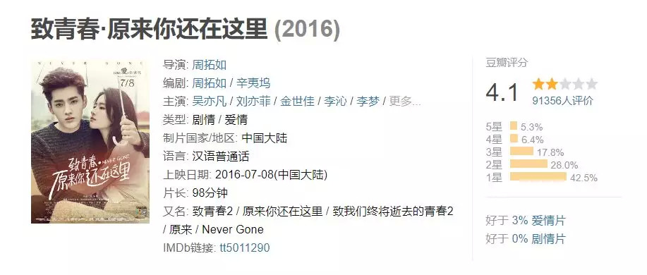 截至目前,这部电影在豆瓣评分为4.1,好于3%的爱情片,好于0%的剧情片。