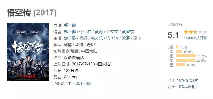 在豆瓣上,《悟空传》的评分仅5.1。在页面下,充斥了各种对电影改编不满的声音,而给出高分的用户也是因为电影特效不错。
