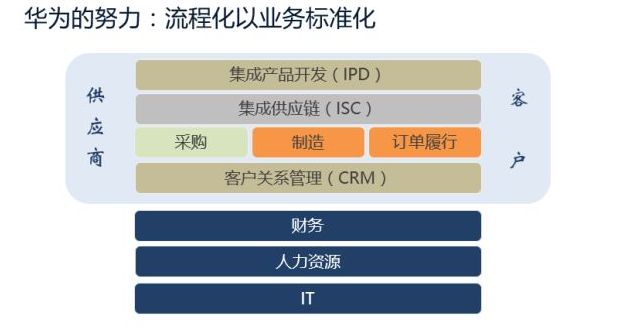 我们通过下面两张图来看华为的做法。1996年以后,在华为完成二次创业的过程中,一直沿着这个思路走,进行了三个业务过程的梳理,其实就是实现业务流程化和标准化。同时,人力资源管理的核心是实现管理职业化和人才专业化。