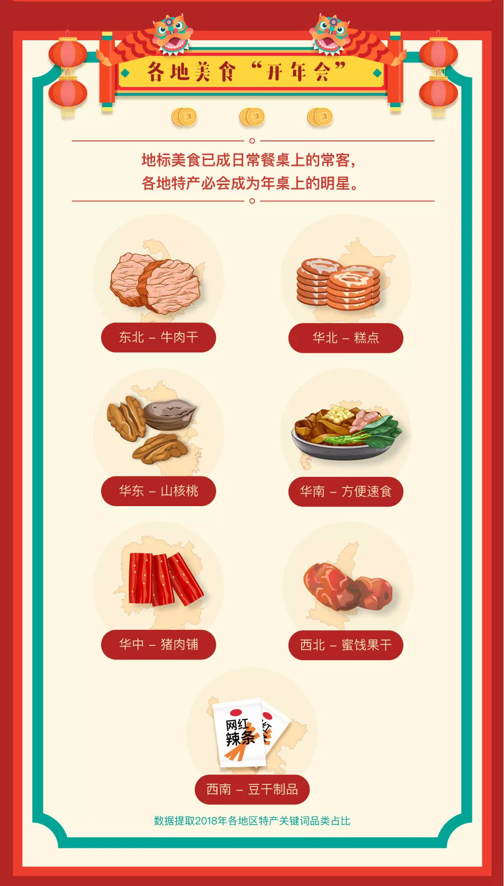 作为年桌上的常客,地标美食又怎会缺席2019的年味盛宴呢~如《年味图鉴》所示,东北牛肉干、华北糕点、华东山核桃、华南方便速食、华中猪肉铺、西北甜饯果干、西南豆干食品均在“年桌”上占有一席之地。