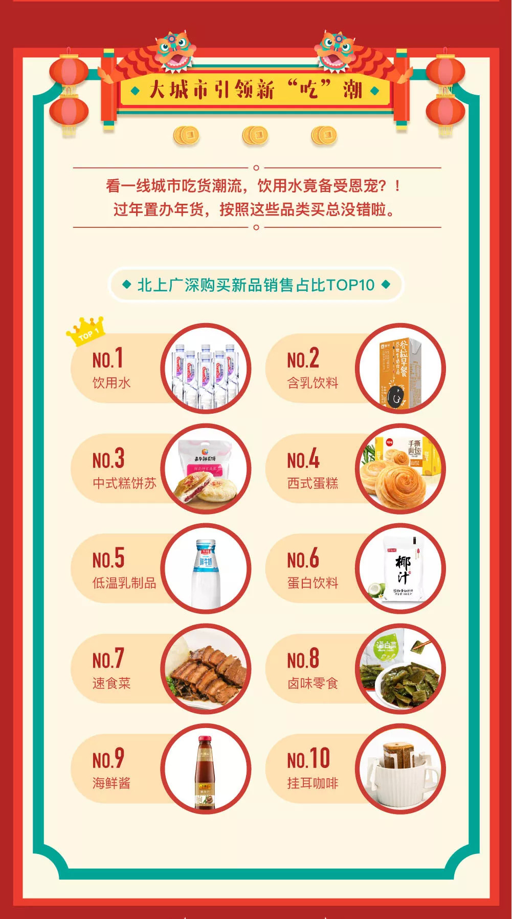 而向来走在潮流尖端的一二线城市消费者,在“吃”上依然下了足功夫,引领吃货潮流。根据《年味图鉴》显示,从北京、上海、深圳、广州、苏州城市线上食品类目消费新品销售占比排名来看,基础的饮用水居然成为了他们的头号新宠。此外,含乳饮料、中式糕饼酥、西式蛋糕、低温乳制品、蛋白饮料、速食菜、卤味零食、海鲜酱和挂耳咖啡均TOP10上有名。足见“潮”食客们中西合璧、速食并行、调味添花的新“食”相。