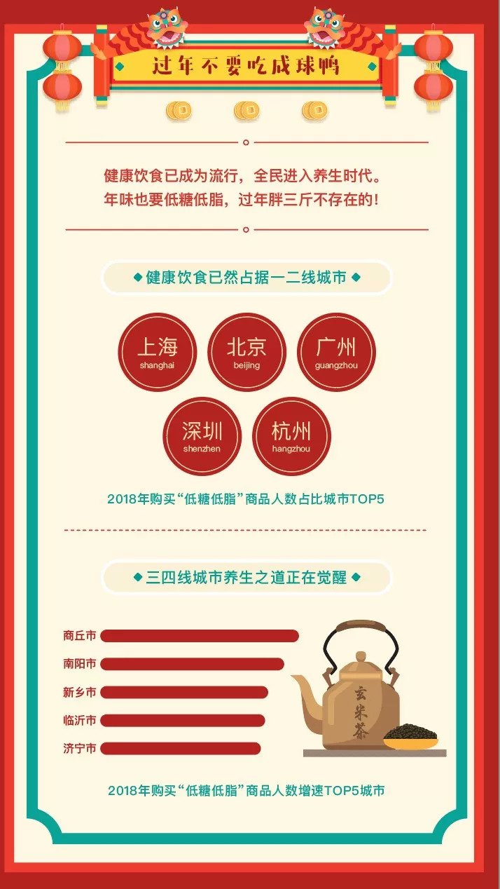 朋克养生的风潮吹整年,就算过年也要继续养生。根据《年味图鉴》发现“健康饮食”已然占据一二线城市消费者的心,北京、上海、广州、深圳、杭州荣当2018年购买“低糖低脂”商品人数最多的城市Top5;与此同时,三四线城市的吃货们也不甘示弱,商丘、南阳、新乡、临沂和济宁成为2018年购买“低糖低脂”商品人数增速最快的城市Top5。