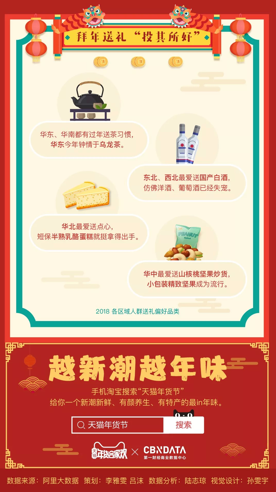 舌尖上的年礼,送对“胃”才叫好。赶紧掌握《年味图鉴》为各地吃货划的重点:对于有过年送茶习惯的华东、华南地区消费者而言,乌龙茶今年尤其获得华东地区茶客的欢心;国产白酒正得东北、西北地区酒友的宠爱;对于最爱送点心的华北地区吃货而言,今年短保半熟乳酪蛋糕就挺拿得出手;小包装精致坚果,则在最爱送山核桃果炒货的华中地区消费者中正流行。