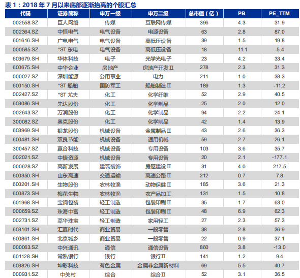 自 2018 年 6 月以来,大盘的运行可以被粗略划分为 6 个波段,在每一个波段内股价均创出阶段性低点,且位置逐渐下移。我们统计个股在这同样 6 个波段内区间最低价,并选出逐级抬升的标的。