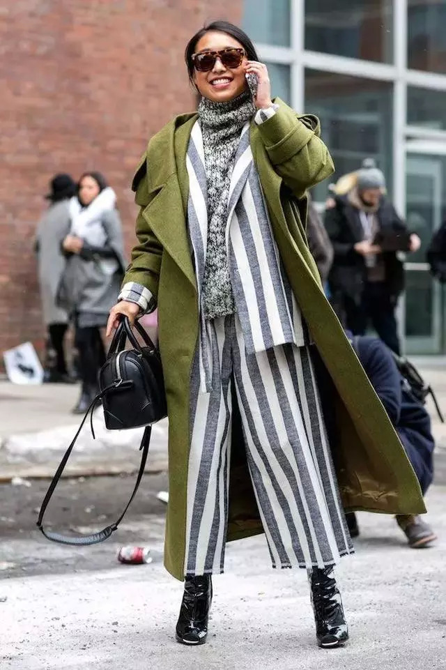 胡椒梗色这种低饱和黄绿色制成的大衣外套,搭配一身灰白条纹阔腿裤,气场全开,也许你会瞬间爱上这款风格多变的色彩。