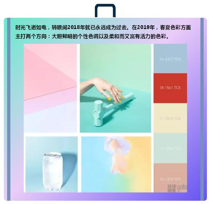 随着时代的不断进步,色彩也在不断地向前突破与发展。2019年,色调整体将更显温暖甜美与浓郁。粉蜡色与荧光色的完美结合使人眼前一亮,当这两种色彩巧妙组合在一起时,你无法想象它们将碰撞出怎样令人惊艳的火花;而暖棕色与水蓝色所形成的色彩平衡,彰显舒适亲切的风格,在我们的日常生活中随处可见。