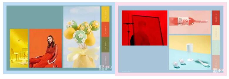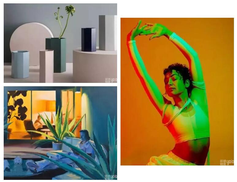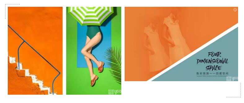 同样效果的颜色搭配,还有柠檬黄与草木绿,火焰红与尼罗蓝,桔红与草木绿、尼罗蓝等,这样的颜色组合既能凸显夏日的活力四射,又能为整个明亮的底色注入一片清新、沉稳,使整个色调保持柔和,浪漫又不失温情,将夏天塑造成一个美好、舒爽、透亮的感觉。