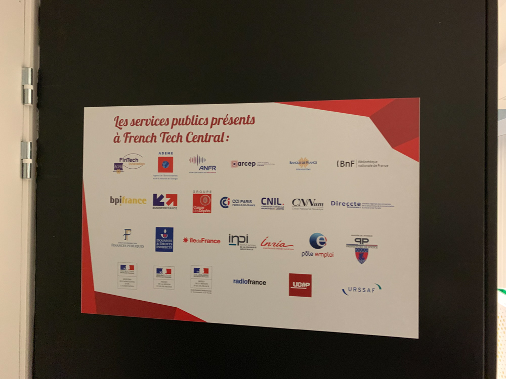 二楼有一块铭牌,上面列着二十四家政府及社会服务机构,为创业公司提供服务,包括税务、海关、邮政、电信、媒体、环保、人力资源外包、版权和专利、银行、公共投资机构等。有意思的是,设立在这里的税务机关不是为了征税,而是负责向初创公司发放补助和退税的。法国邮政这些年已经很少再设立新的邮局,StationF的服务点是为数不多的几家之一。