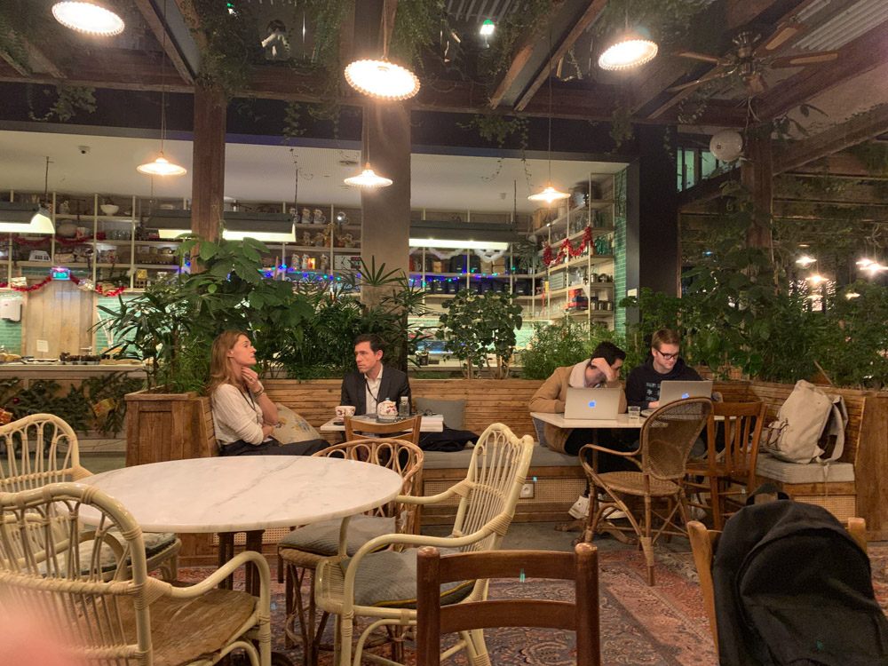StationF的第三段则是一个花园式的欧洲最大的餐厅,FELICHEZTA,同时混合着游乐场、咖啡馆、花园和派对现场等诸多的场景。墙边安放了一台法国很少见的“四连拍”机器,以及几米长的照片墙。整体的玻璃屋顶和开放式空间,有几人高的绿植,也有迷你型的盆栽,将空间自然地区隔出来。负责运营的是个长发女孩,就坐在餐厅里和人聊事情,Emmanuel对她赞不绝口:年轻、漂亮、能干,还抽空生了两个小孩。