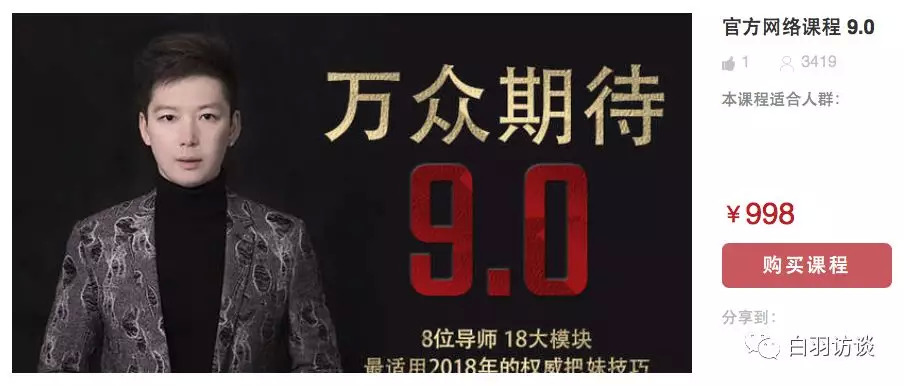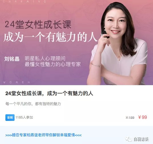 白羽访谈记者花费39.9元购买了某“女性魅力成长”课程,课程导师是国家二级心理咨询师,但是 8节系列课程听下来,有像“吸引力法则”这样透着心理学原理的观点,也有像“不敢自黑的女人在两性关系中很难有好的结果”这样让听众打一星的结论。