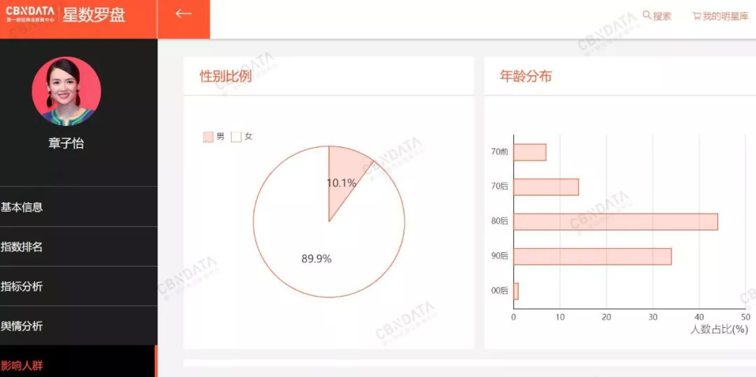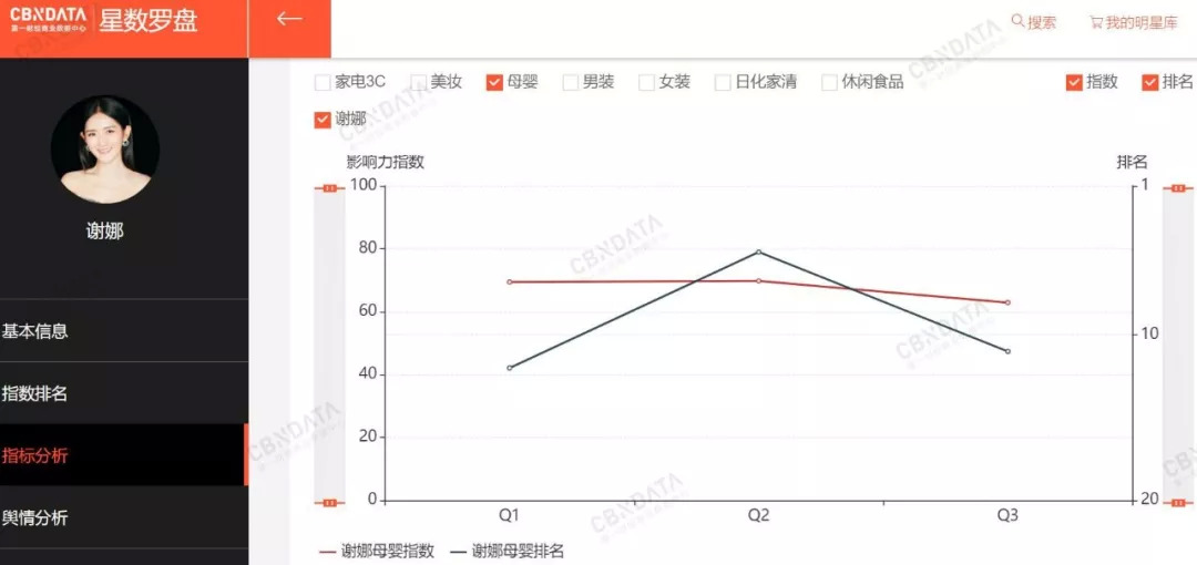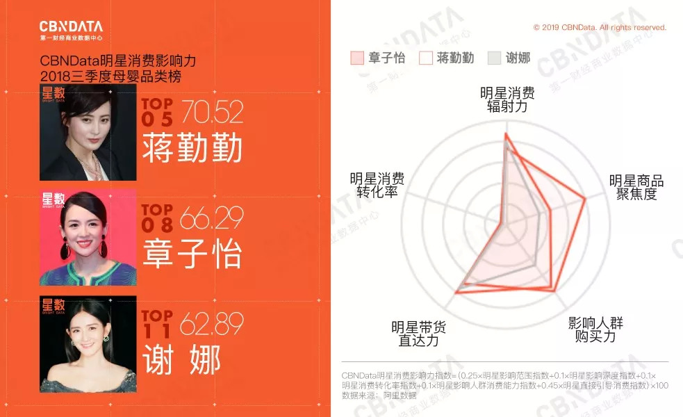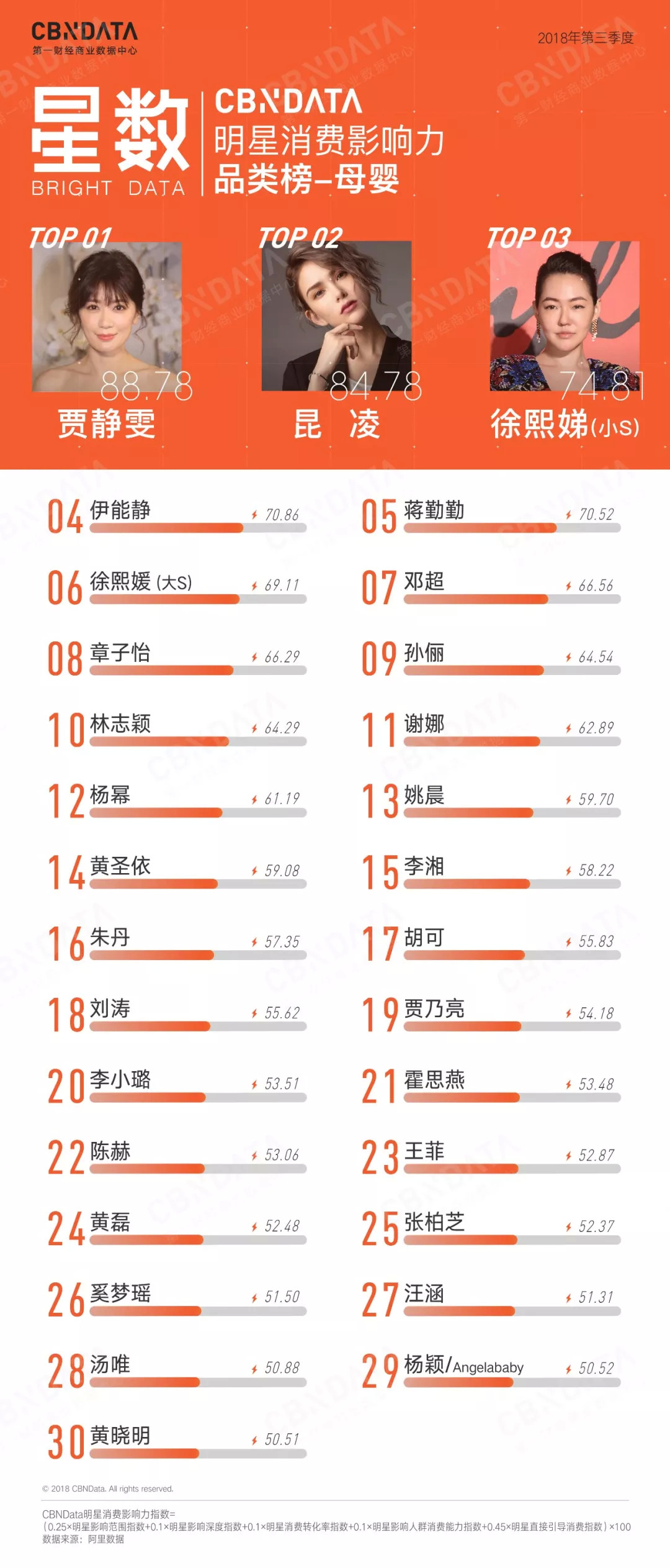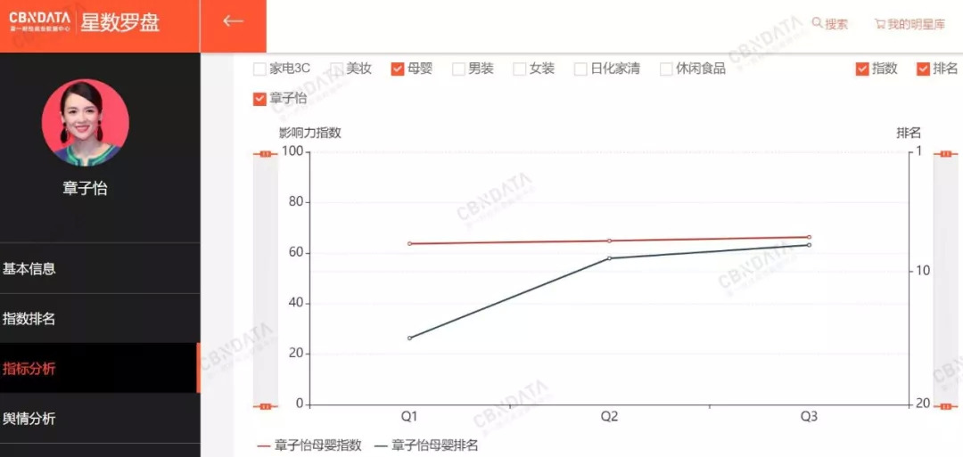 从CBNData星数罗盘的数据分析可以看到,章子怡在母婴领域的消费影响力排名日渐上涨,从第一季度的15名,一路飙升至第三季度的第8名。而且消费决策受她影响的人群也以80后女性为主,所以选择母婴这个领域发力,也算是明智之举。