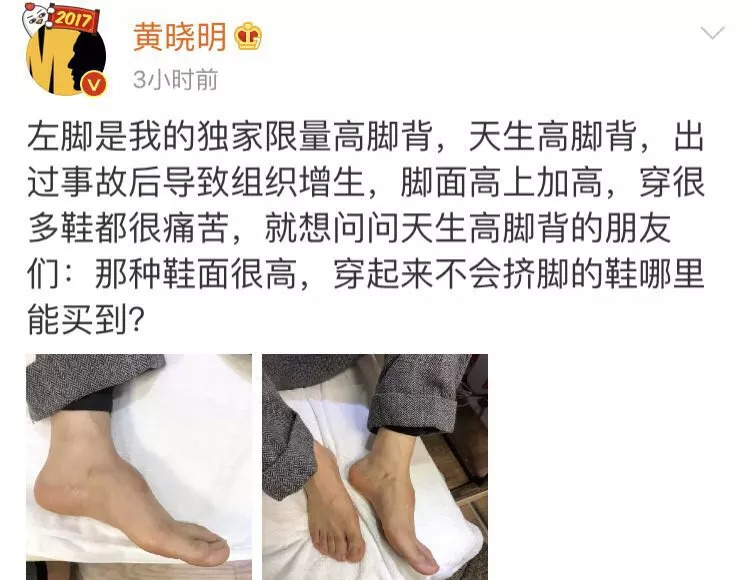 之前,黄晓明参加活动的时候,网友发现他的脚背弓起十分明显,质疑他是不是垫了鞋垫。今天,黄晓明发微博回应这件事:“左脚是我的独家限量高脚背,天生高脚背,出过事故后导致组织增生,脚面高上加高,穿很多鞋都很痛苦。”最后,他还问网友:“穿起来不会挤脚的鞋哪里能买到?”