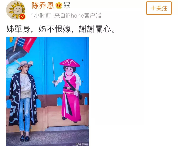 最近,网上有爆料说陈乔恩和杜淳已经领证结婚了。有媒体向陈乔恩的工作人员求证,工作人员回复说:“陈乔恩恋爱以及结婚传言均是不实新闻,纯粹无稽之谈,感谢大家的关心。”今天中午,陈乔恩本人发文回应了这个传闻:“姐单身,姐不恨嫁,谢谢关心。”