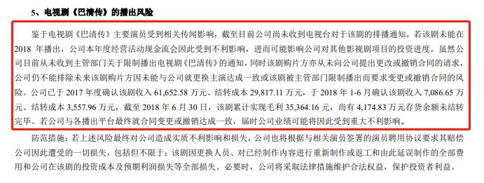 据唐德影视2018年年中报显示,如果《巴清传》未能在2018年播出,其业绩将受到严重影响。截止2018年年中报,该剧已为唐德影视累计实现毛利3.5亿元,目前看将全部化为泡影。2018年唐德影视的业绩如何,可想而知。