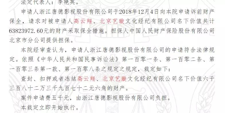 据1月4日中国裁判文书网更新的信息显示,2018年12月4日,唐德影视向法院申请诉前财产保全,经北京市第一中级人民法院审查,裁定查封、扣押或者冻结了高云翔、北京艺璇文化名下价值6382.40万元的财产,立即开始执行。工商资料显示,艺璇文化目前由高云翔之妻董璇全资持有。2018年10月之前,高云翔也曾持有部分艺璇文化股权。