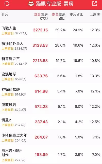 《飞驰人生》的发行方猫眼和《疯狂的外星人》光线传媒均拥有极优的渠道。单看预售,两家的成绩也不相上下,可以说是争夺春节档冠军一号和二号种子选手。