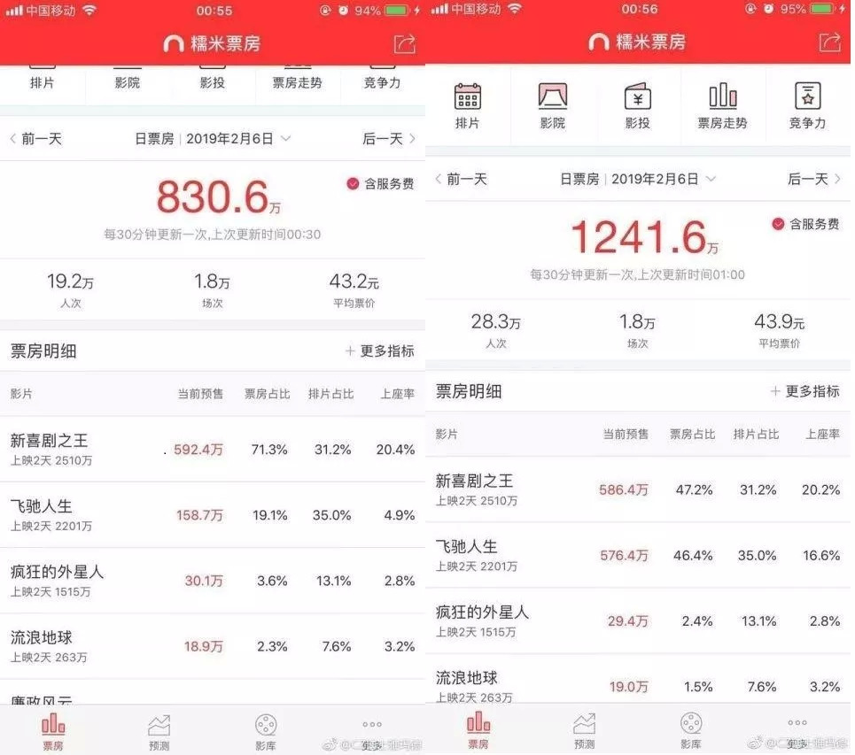 在该网友的截图中,0时55分《飞驰人生》的2月6日的预售票房为158.7万。而仅仅过了一分钟,《飞驰人生》的预售票房如同片名一般,以匪夷所思的“飞驰速度”飙升到576.4万。与此同时,当日预售第一的星爷的《新喜剧之王》的预售票房却蜜汁消失了6万。